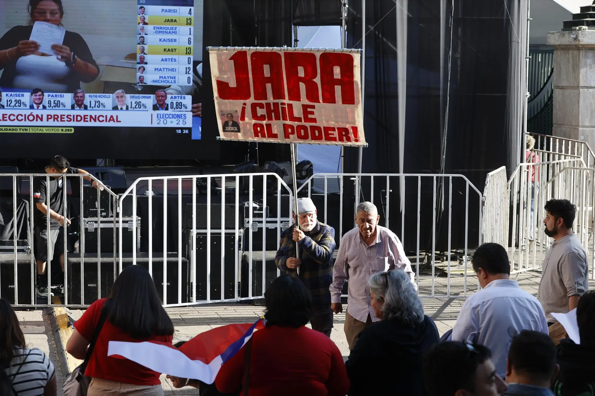 Supporters of the candidate for the Presidency of Chile by the party Unity for Chile, Jeannette Jara, hold a poster after the close of the polls this Sunday in Santiago (Chile). Photo: EFE/ Elvis Gonz...